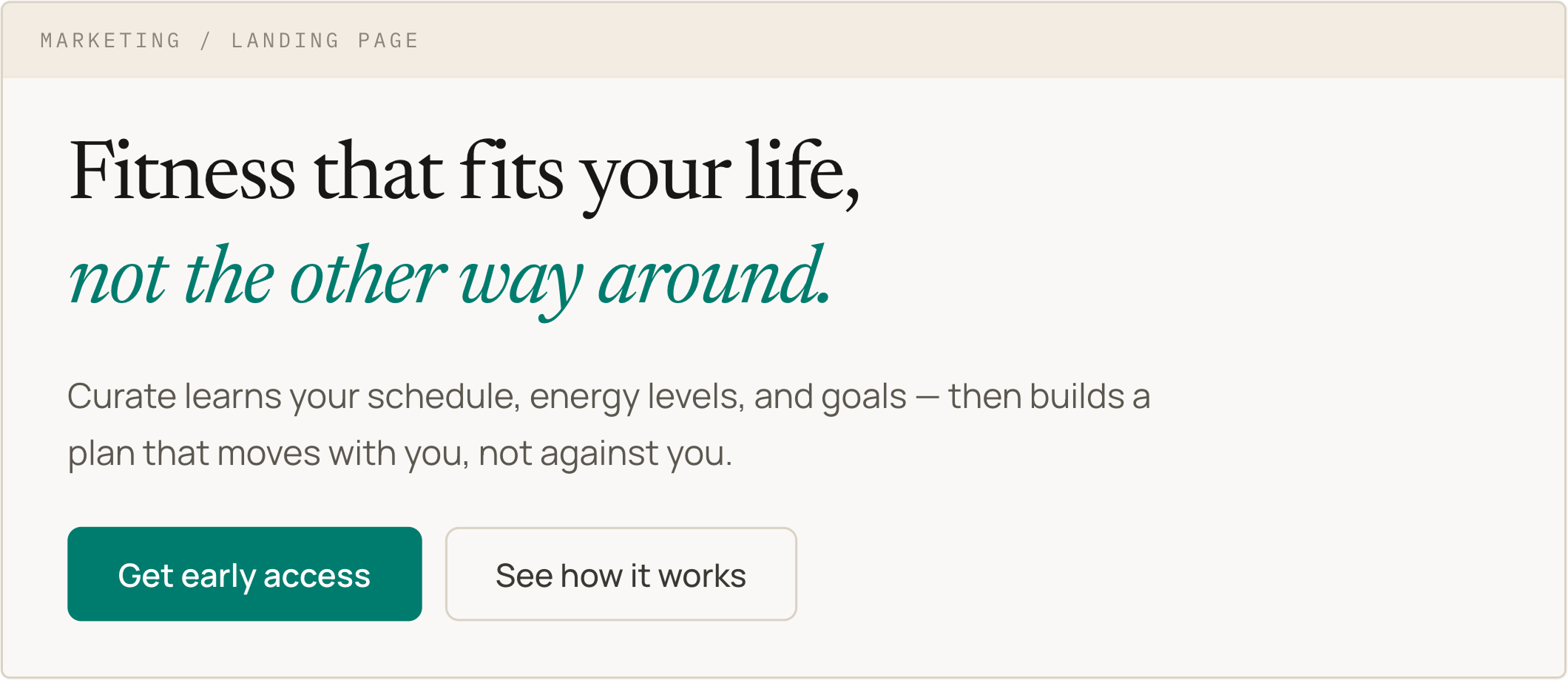 The name came from the strategy. Curate — to select, organize, and present with care on behalf of someone you know well. That's the product's relationship to the user in one word. No fitness clichés, no performance language, no implied judgment about where someone is starting from.