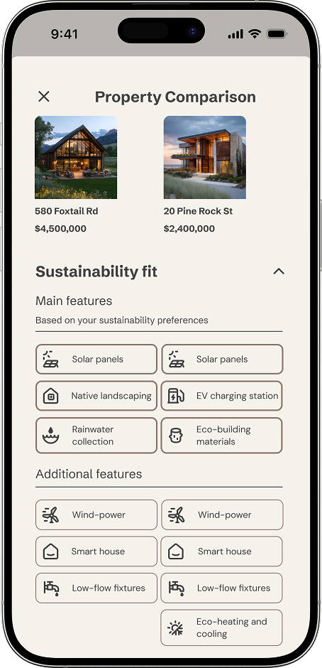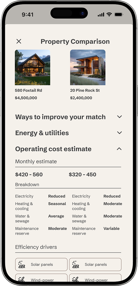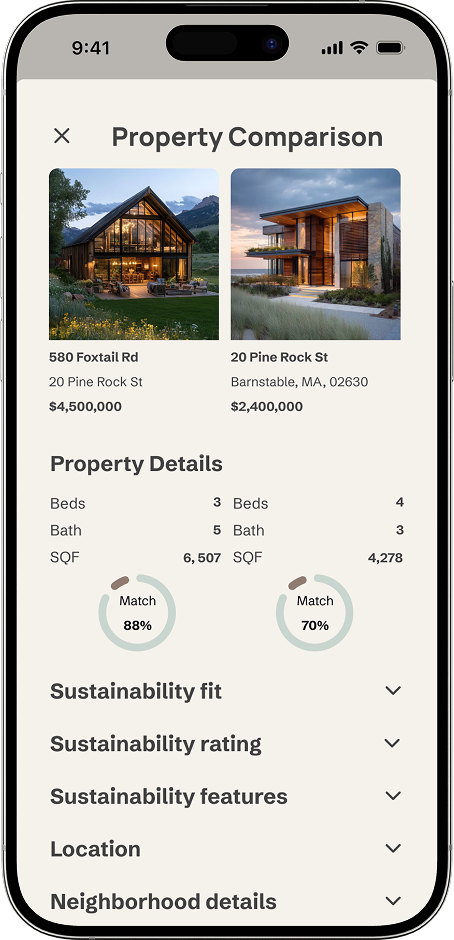 The listing screen was the most information-dense challenge of the project. Progressive disclosure — using accordions for sustainability data, property details, and cost estimates — kept the screen from overwhelming users while ensuring nothing important was hidden.