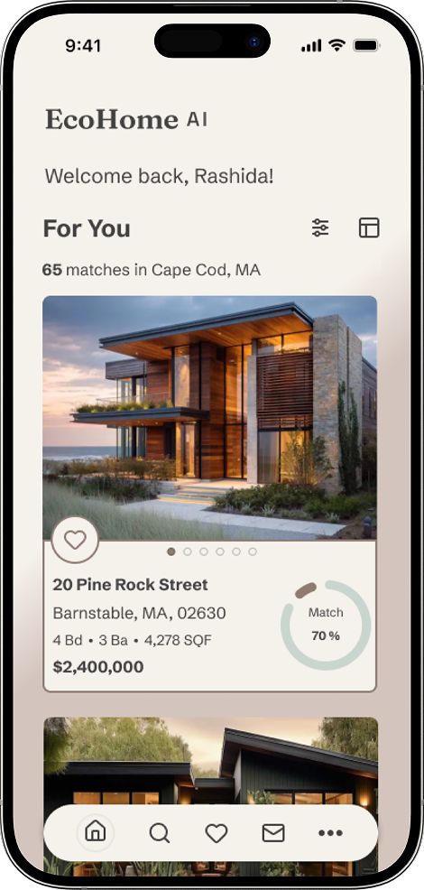 EcoHome AI is a sustainability-focused property discovery platform designed to help buyers evaluate homes with confidence. This was a concept project completed as part of my product development certification — representing a full end-to-end UI design process across mobile, tablet, and desktop.