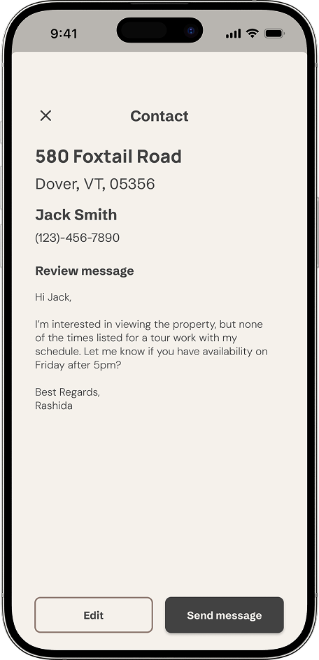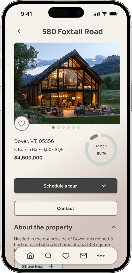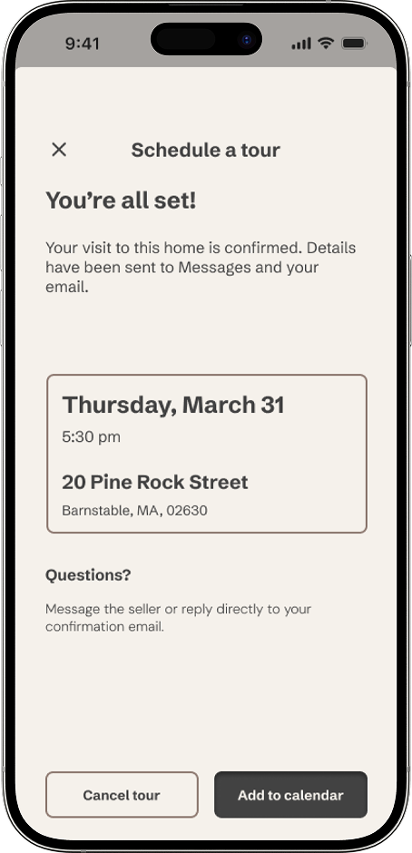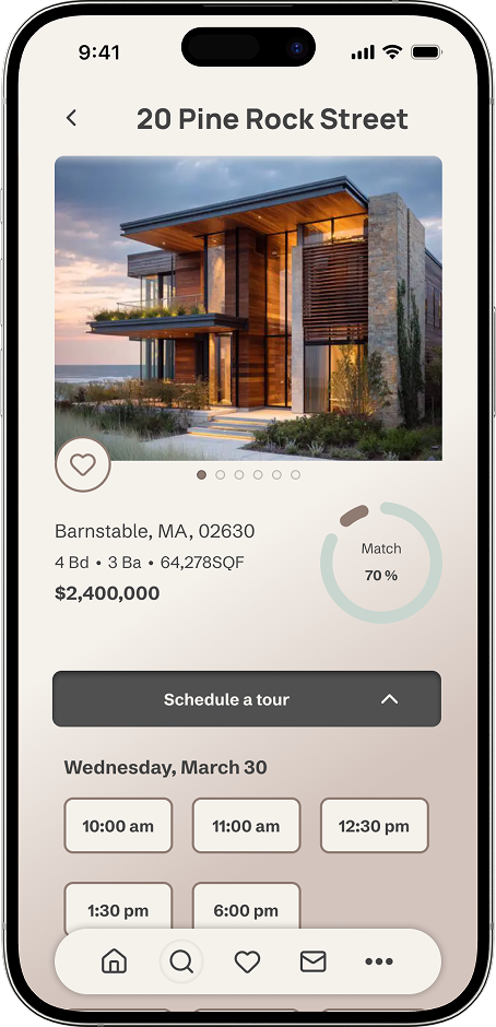 I designed a clear, low-friction path for users to contact sellers and schedule tours directly from a listing. A familiar chat-based interface helps users communicate confidently without needing to learn a new interaction pattern, reducing cognitive load at a high-intent stage.